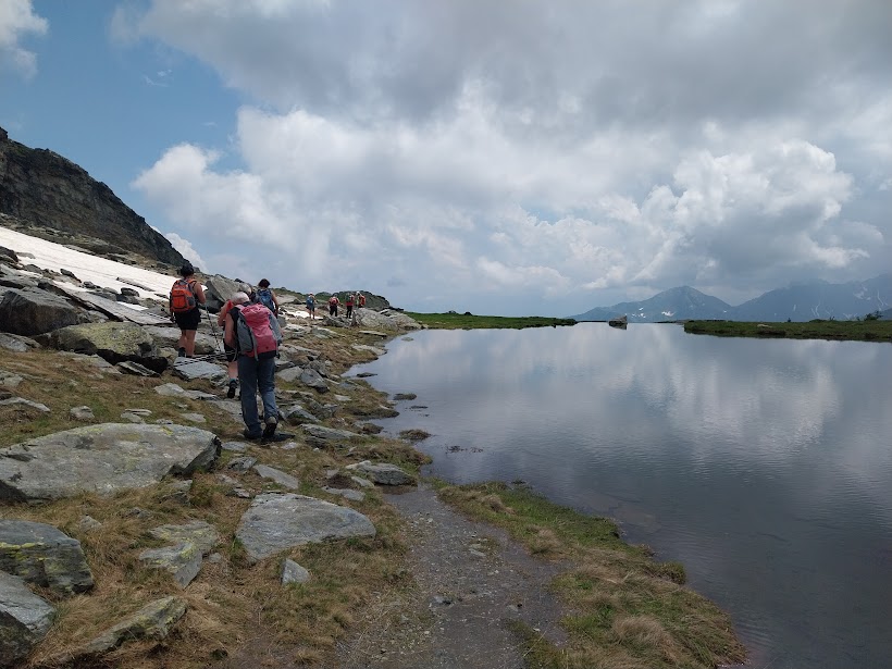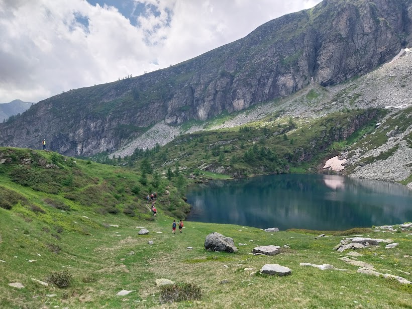 Dopo mesi festeggiamo il ritorno del Presidente nei ranghi. Ed anche quello del Presidente della Sezione Balneare, nonché medico di servizio, che sovrintende solitamente ai bagni nei laghetti di montagna. Insieme alle quattro badanti si occuperanno oggi di cinque anziani, uno dei quali, prudentemente, si fermerà al Lago Inferiore. La giornata è bella, molto calda a fondovalle, ma con la proverbiale arietta fresca dell’alta Val Bognanco che ci farà gradita compagnia. Ritrovo a Mocogna e caffè a Bognanco Fonti. Parcheggiamo presso il rifugio di San Bernardo, 1630. Lungo la gippabile scendiamo al ponte sul rio Rasiga, 1600, attraversiamo e risaliamo al primo tornante. Qui, tenendo la destra, imbocchiamo il sentiero e, al primo bivio, ancora nel bosco, puntiamo a nord (sinistra), raggiungendo i prati dell'Alpe Paione, 1780. Sostiamo brevemente in prossimità del rifugio, quasi sempre chiuso. Ahimè, che spreco! Proseguiamo con passo tranquillo sul sentiero D10, evidente, fino al Lago Inferiore, 2003 (poco più di un’ora e un quarto). L’anziano pluriacciaccato e mai allenato ci raggiunge, ma si ferma qui prudentemente. Pausa colazione ed inizia la salita vera e propria, sulla destra del lago, con il breve ma duro strappo che porta al Lago di Mezzo, 2150. Qui c’è ancora tanta neve e i miei ragazzi improvvisano una innocua battaglia “a palle”. Dopo il pianoro del lago un altro breve strappo, che si può percorrere su nevaio o su sentiero, porta al grande pianoro del Lago Superiore, 2269 (tre quarti d’ora), che costeggiamo sul lato orientale attraversando il grande nevaio su dolce pendenza, preceduti da anziani ma forti battitori di pista. Il bellissimo specchio d’acqua è ancora completamente ricoperto da uno spesso strato di ghiaccio, tranne che all’estremità meridionale. Finito il “traverso” su neve, che crea qualche problema a scarponi non adatti, resta il ripido e faticoso strappo finale, senza neve grazie all’esposizione e alla pendenza, che porta ai 2429 metri del Passo di Paione (poco più di mezz’ora). Si apre sotto di noi la Val Divedro e di fronte il nord dell’Ossola, fino all’Oberland Bernese. Un altro dei nostri superbi panorami! La discesa verso gli alpeggi divedrini è vivamente sconsigliata. E’ terreno per cacciatori ed alpinisti coraggiosi. Dopo la doverosa pausa sullo stretto crinale fra Bognanco e Divedro, propongo di scendere al Lago Superiore per evitare discese troppo ripide a stomaco pieno. Scendiamo verso il lago, fra prato e neve che possa mantenere al fresco le birre, e pranziamo. Riprendiamo la discesa costeggiando il lago sul lato occidentale, senza neve, Sempre lungo il sentiero D10 ripassiamo dal Lago di Mezzo, dal Lago Inferiore e dall’Alpe Paione con la sua sempre apprezzata fontana. Dopo due ore e un quarto dal Passo siamo al parcheggio di San Bernardo ed al rifugio, dove confusamente ordiniamo fresche bevande. Il sole di oggi ci ha veramente cotti a fuoco lento.