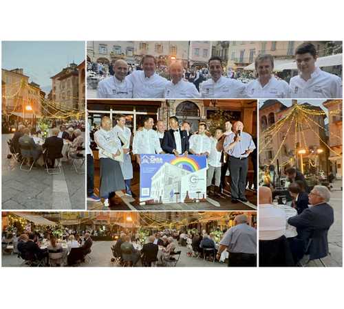 DOMODOSSOLA- 03-09-2024—Una serata indimenticabile per i partecipanti alla cena di gala di Domosofia Gormet in piazza Mercato. Una cornice suggestiva resa ancor più magica dalle luci che la addobbavano e dall’atmosfera creata con il sottofondo musicale e con le proiezioni sulle case della piazza.
