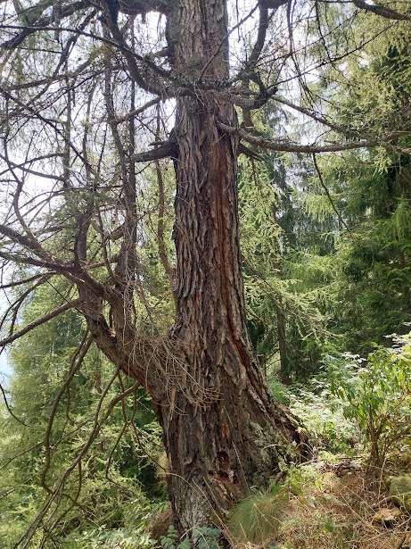 Rododendri, mirtilli, larici prendono il posto degli abeti e delle vaste praterie del versante sud. Raggiungiamo in pochi minuti l’Alpe Curtvel (Curtvello), 1756, con la sua bella fontana di legno e pranziamo vicino all’altrettanto bella baita. Ci manca molto oggi il buon caffè della badante esperta, presa da impegni di mamma. Riprendiamo la discesa nel bellissimo bosco di larici e su un lungo traverso verso oriente con scorci stupendi sul Pizzo Andolla e sul bacino dell'Alpe dei Cavalli, Cheggio per gli amici.