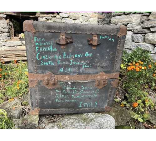 Del baule si sa ben poco solo quello che è scritto su un lato, ovvero che è stato spedito dalla famiglia "Canzio 1145 Belmont Ave South Bend Indiana 46615 Usa alla famiglia Sanzio in via Achille Grandi 2 28037 Domodossola provincia Novara Italia".