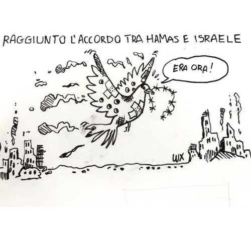 Cosa aggiungere? Col suo tratto essenziale ed evocativo, l'architetto Carlo Lux ci offre un flash sulla notizia più importante di queste ore. Sperando che la colomba bianca possa avere abbastanza tempo per guarire dalle ferite.