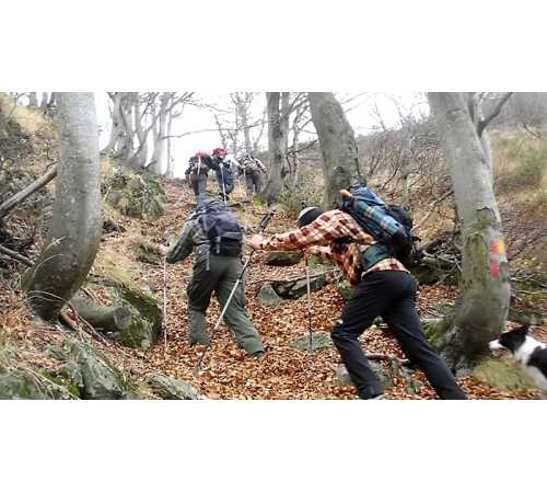 Imbocchiamo il sentiero S25 ben segnato per il bivacco Lidesh, ci alziamo nei prati ed entriamo nel bel bosco di faggi. Il terreno è umido e scivoloso, con uno spesso strato di foglie che lo rende ancora più insidioso per la nostra età media elevata. Nei tratti più scomodi ci aiutano delle geniali catene. Una rapida colazione nel bosco e, dopo quasi due ore da Provola, raggiungiamo Il Motto, 1508, e i ruderi dell'Alpe Mut, 1493.