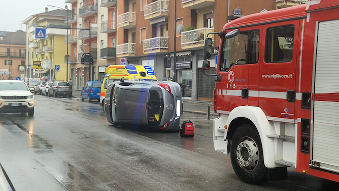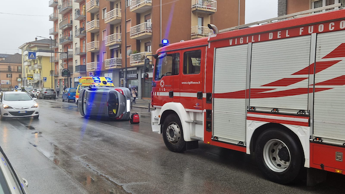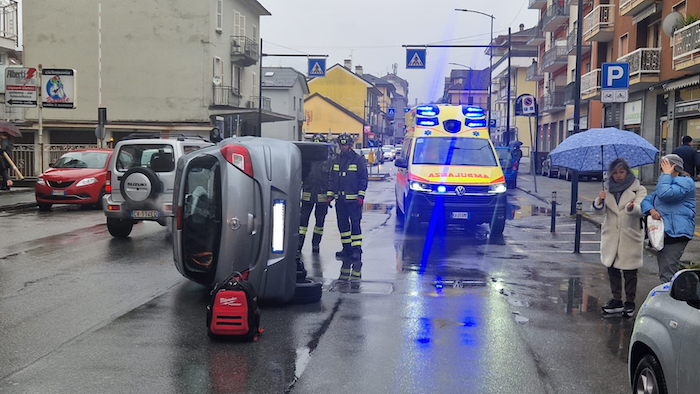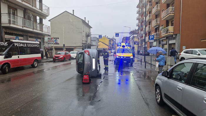 DOMODOSSOLA - 30-1-2025 -- Momenti di paura giovedì mattina in via Giovanni XXIII quando, intorno alle 10.30, una Opel ha terminato la sua corsa ribaltandosi su un fianco dopo aver urtato due vetture parcheggiate a bordo strada.