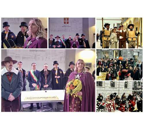 DOMODOSSOLA- 22-02-2025-- Il Togn e la Cia hanno ricevuto le chiavi della città: il sindaco Lucio Pizzi ha accolto le maschere in Sala Falcioni, dopo la sfilata per il borgo del Comitato Pulenta a Sciriuii con la Corte di Mattarella e gli amici svizzeri, per la tradizionale cerimonia che segna l’inizio dello storico Carnevale domese.