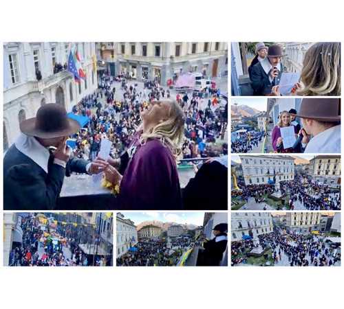 Complici i lavori di teatro Galletti che occupano con il loro contiere una parte di piazza Mercato, il matrimonio rituale tra le due maschere domesi รจ avvenuto in piazza Repubblica dell'Ossola, davanti al Municipio, e davanti a migliaia di persone.
