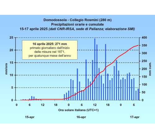 A fare notizia è soprattutto il dato registrato ieri, 16 aprile 2025, dall’Osservatorio meteorologico di Domodossola - Collegio Rosmini, riconosciuto dalla WMO come “stazione centenaria” e gestito dal CNR-IRSA di Verbania-Pallanza. Con 351 mm di pioggia caduti in 24 ore, è stato infranto ogni record storico: mai, in 154 anni di misurazioni, era piovuto così tanto in un solo giorno. Superati sia il precedente primato di aprile (174 mm del 1977) sia il record assoluto (247,6 mm del 1987).