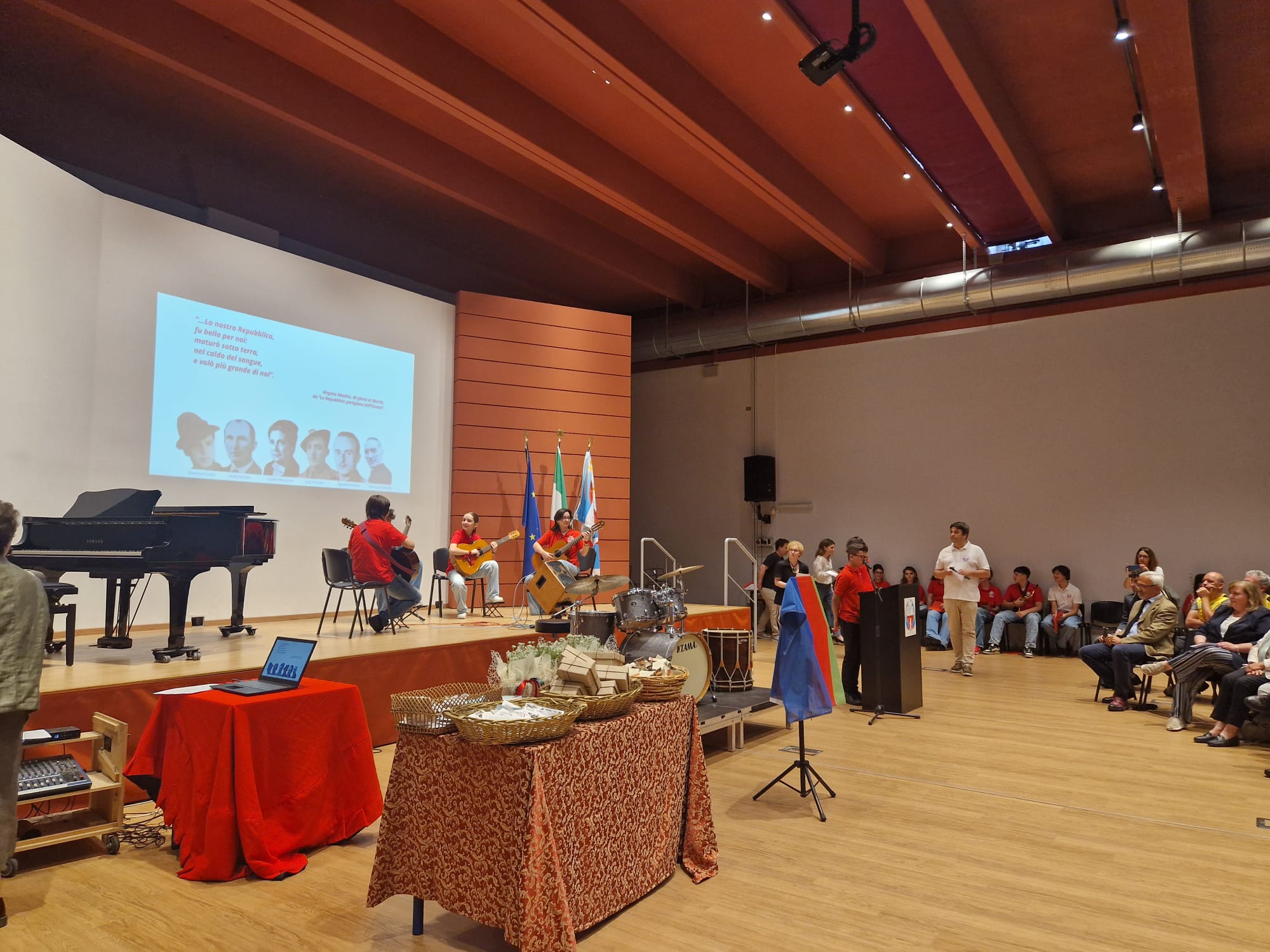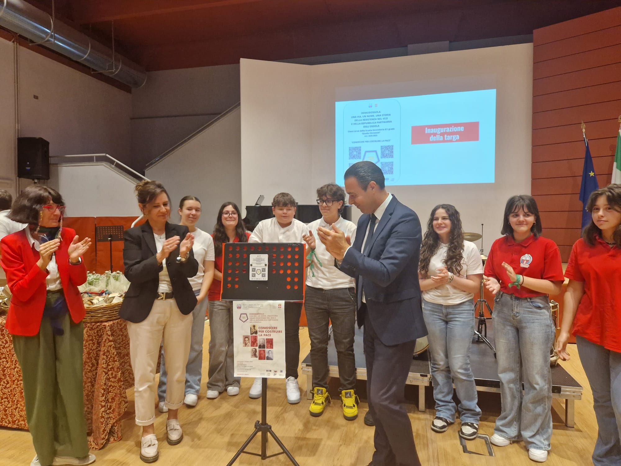 DOMODOSSOLA - 4-6-2025 -- Questa mattina nell’aula magna della scuola media Gisella Floreanini di Domodossola – nell'ambito delle celebrazioni dell'80° anniversario della Repubblica Partigiana dell'Ossola, si è svolta la presentazione del progetto “Una via, un nome, una storia della Resistenza del VCO e della Repubblica Partigiana dell'Ossola”. L’importante iniziativa coordinata dalla prof.ssa Flora Valterio intende promuovere gli ideali della Resistenza con la valorizzazione delle vie domesi, dedicate ai protagonisti della lotta partigiana. Spiega Valterio: «160 alunni di terza media, guidati da una cinquantina di insegnanti hanno ideato un progetto che unisce varie discipline: storia, lingue straniere, arte, tecnologia e musica, ricostruendo le storie di alcuni dei protagonisti della Resistenza in Ossola, uomini e donne a cui sono intitolate trentadue vie della città». Il percorso urbano è interattivo, accessibile tramite QR code in targhette che saranno affisse durante l’estate accanto ai cartelli stradali delle vie analizzate: chiunque potrà ascoltare attraverso la voce dei ragazzi, nelle varie lingue (italiano, tedesco, inglese e francese) 128 audio di testi autobiografici che raccontano la vita di questi uomini e donne della Resistenza. Le musiche provengono in parte dal repertorio dell’Associazione Cantar Storie mentre altre sono state arrangiate e suonate dagli alunni dell’indirizzo musicale delle Floreanini. L’iniziativa è finanziata dal Comune di Domodossola per la stampa e l’affissione delle targhette e dalla Pro Loco per le cartoline pubblicitarie, con la collaborazione della Casa della Resistenza di Fondotoce, l’Istituto Storico della Resistenza “Piero Fornara” di Novara, il Museo partigiano Raggruppamento Divisioni patrioti “Alfredo di Dio” di Ornavasso-Busto Arsizio, l’ANPI provinciale, e l’Associazione Cantar Storie. Il sindaco Lucio Pizzi e la preside Chiara Varesi hanno inaugurato una delle targhette, ed è stato lanciato anche il sito web che raccoglie i testi.