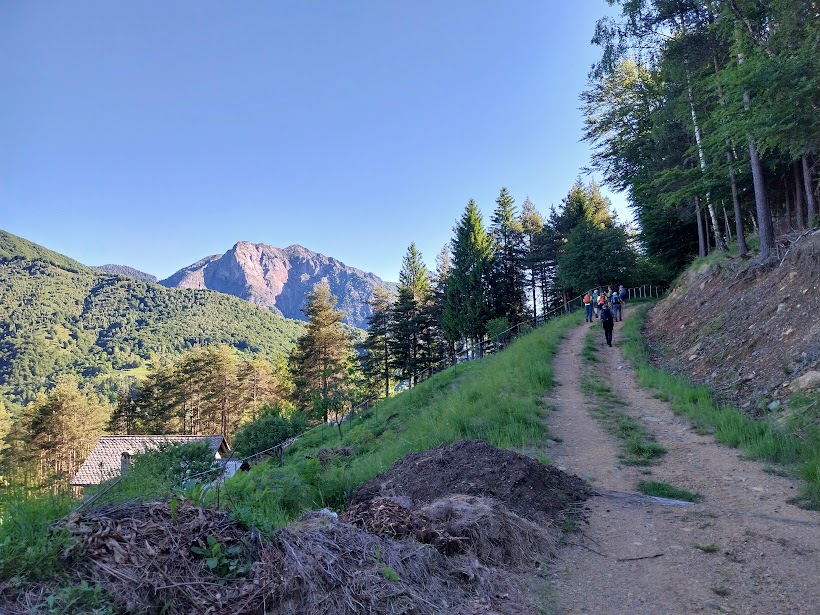 Di qui partono il sentiero M22 ed una pista sterrata, che seguiamo, inizialmente ripida poi pianeggiante, verso sud est. Di fronte a noi, a nord, quella splendida montagna che a noi tanto piace che è il Pizzo Ruscada, da dove un anziano amico, solitamente astemio, dopo un grappino vide anni fa il Monte Bianco (era il Rosa innevato). Siamo sulla dorsale fra Rio Ferro, a oriente, e Rio del Motto, a occidente. Passiamo sotto i prati dell’Alpe Vacchereccio, 822, ed arriviamo nella forra del Rio Ferro, Non si può attraversare qui perché il sentiero è franato.