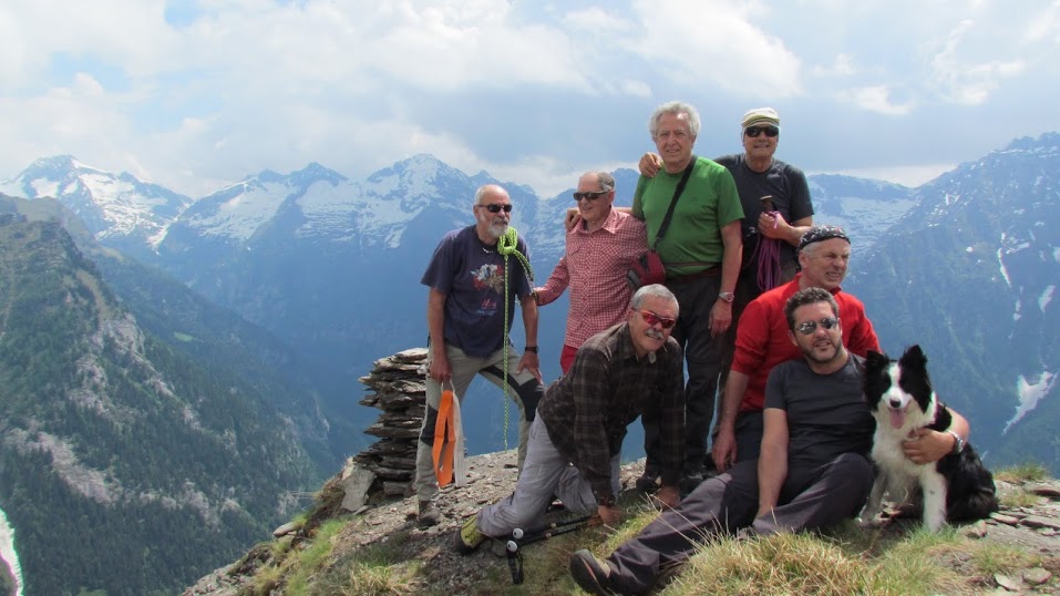 Qui si fermano, saggiamente, tre umani e due quadrupedi, al guinzaglio dei loro padroni. Gli altri nove, seguendo una traccia facile ma in leggera esposizione, raggiungono rapidamente l'aerea vetta della Punta di Campo, 2238. Il versante nord di questa cima è da “sestogradisti”. Lo ammiriamo cautamente, con il massimo rispetto dovuto da chi, come noi, in montagna cerca soltanto un prudente divertimento.