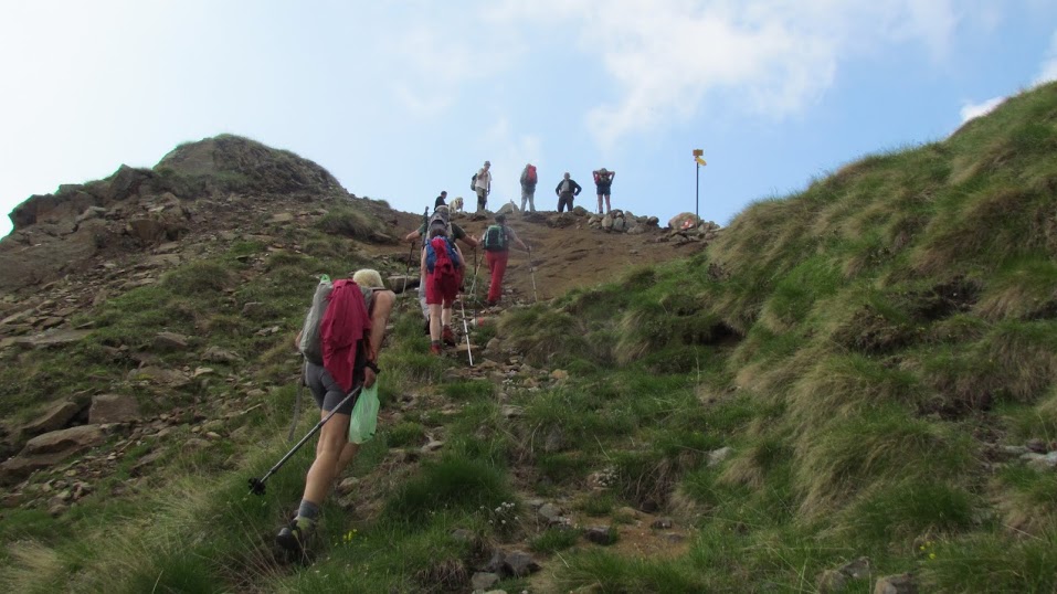 Un passaggio facile, ma leggermente esposto, porta dall'anticima alla cima. Qualcuno trova anche il tempo di posare con scarsa delicatezza la faccia sul prato, fortunatamente senza danni, nonostante le raccomandazioni delle autorità. Ridiscendiamo al passo e recuperiamo i materiali ivi parcheggiati. I primi nuvoloni si addensano, ma tanto non pioverà fino a tarda sera. Ci avviamo in discesa lungo il sentiero di salita per circa duecento metri e, ad un bivio, ne imbocchiamo uno verso sinistra (nord), prima in leggera discesa e poi in risalita per poche decine di metri fino al Passo del Crac, ufficialmente 1968, ma a me sembra un po' meno.