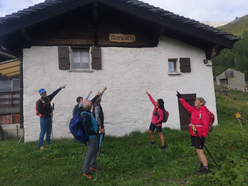 Oggi tre anziani “impegnativi” richiedono ben tre badanti più una “di scorta”, per maggiore sicurezza. Parcheggiamo a Engiloch, dove ci accoglie un vento freddo che ci fa estrarre rapidamente guanti e berretti parcheggiati da mesi in fondo agli zaini. I calzoni corti delle quattro signore ci fanno avvertire ancora di più il freddo. Ma loro non fanno una piega. Che donne! C'è anche un fronte nuvoloso verso il Passo, ma la situazione è in via di miglioramento, come da previsioni. Perdiamo subito una decina di minuti scendendo ad attraversare il torrente, che da noi diventa Diveria, per poi tornare sulla retta via riattraversandolo poco più a monte in corrispondenza delle case di Nideralp. Proseguiamo verso nord fino a Gampisch, dove ci fermiamo ad osservare la scritta “Murmolta” su una baita.