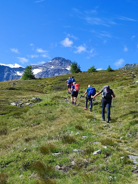 Ci incuriosisce la somiglianza al nome walser del nostro gruppo: Murmäta. Qui torniamo sulla destra orografica del torrente ed iniziamo a salire, diretti ora ad occidente. Il sentiero è comodo ed evidente, il passo tranquillo. A quota 2133 troviamo un bivio. A destra si va al Bistinepass, noi andiamo a sinistra verso la Magelicke. Ci concediamo anche una breve pausa colazione, mentre il vento si attenua, le nubi fuggono verso nord e i muscoli caldi ci ridanno un giusto calore, non propriamente estivo ma ideale per camminare dopo le grandi calure del fondovalle.