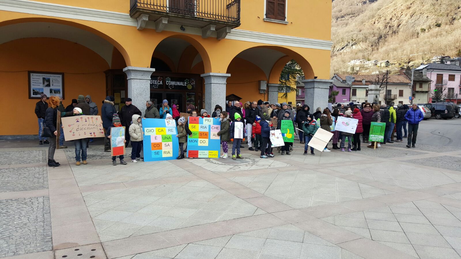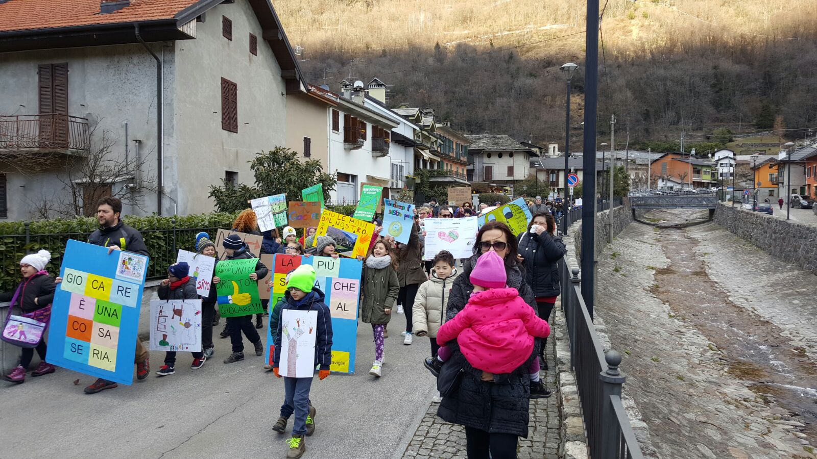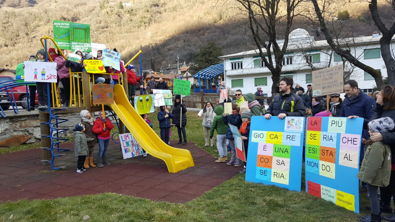Mentre su fronte giudiziario la giunta Monti attende la notifica della sentenza per contare i giorni entro cui applicarla e presentare ricorso, la protesta popolare non accenna a diminuire. Oggi pomeriggio, nonostante l’orario lavorativo e il freddo polare che ha avvolto l’Ossola, al raduno di fronte alla chiesa parrocchiale erano presenti una cinquantina di bambini e un centinaio di adulti. Tanti i cartelli e gli slogan di protesta; “Rivogliamo il parco giochi” con l’emoticon del faccino triste, “E noi, dove andiamo a giocare?”, “Giocare è una cosa seria, la più seria che esista al mondo”, “Giù le mani dal nostro parco”, “non impediteci di giocare”, “Quando i bambini fanno oh… che meraviglia” richiamando il testo di una canzone di Povia famosa qualche anno fa, “Sos accoglienza negata ai nostri bambini”…