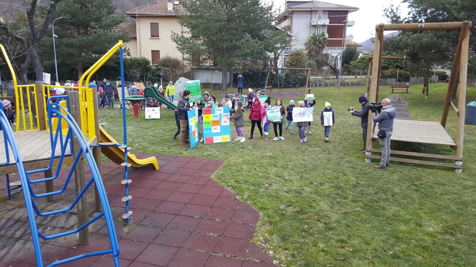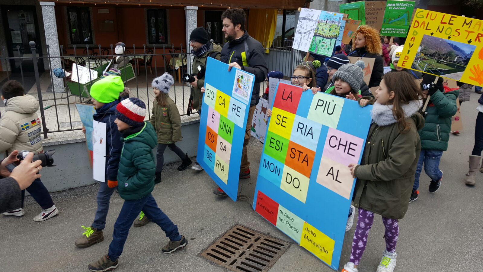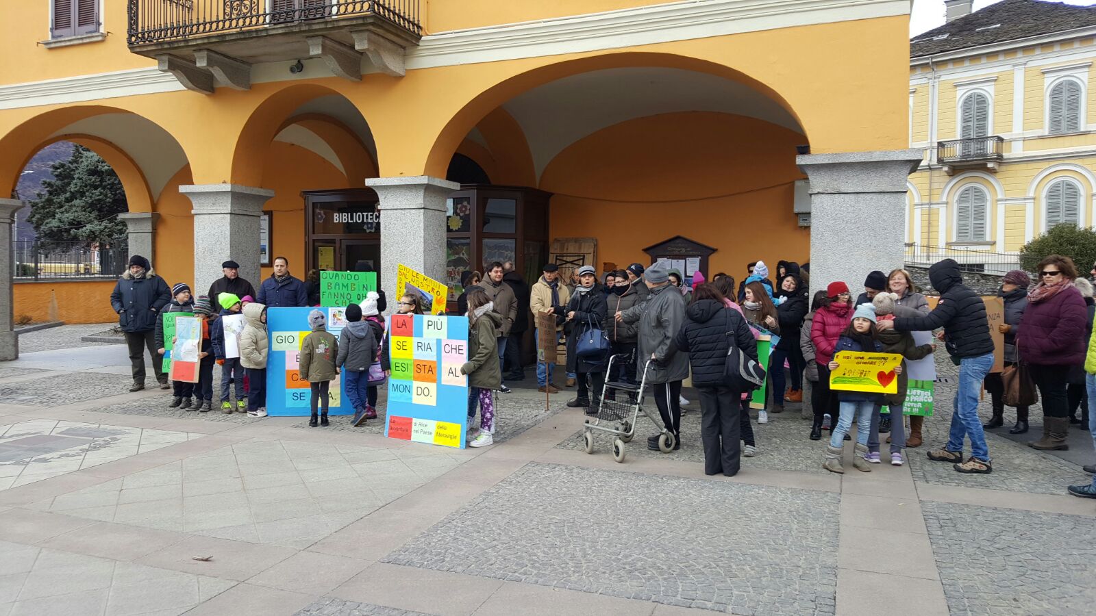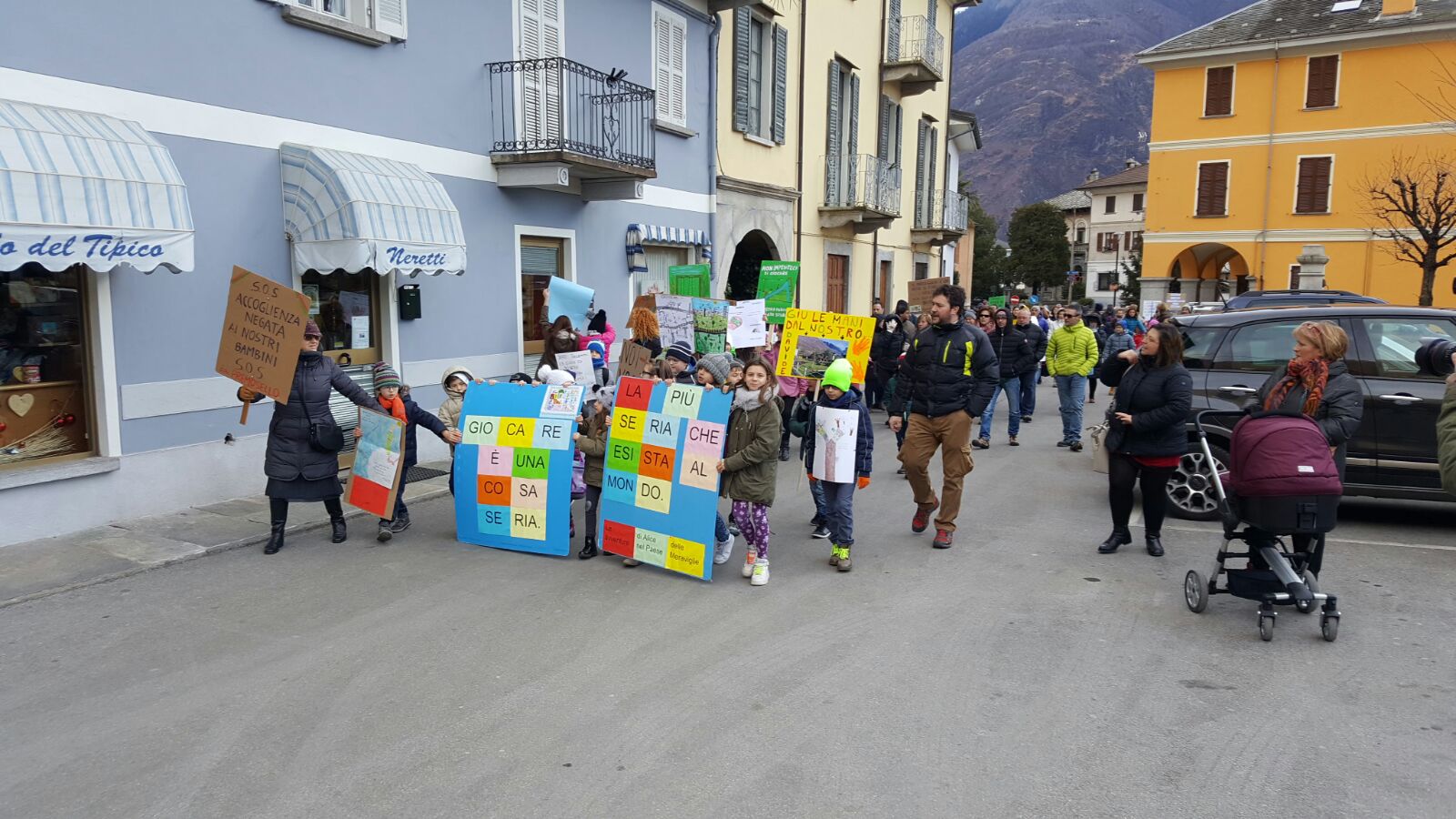 Mentre su fronte giudiziario la giunta Monti attende la notifica della sentenza per contare i giorni entro cui applicarla e presentare ricorso, la protesta popolare non accenna a diminuire. Oggi pomeriggio, nonostante l’orario lavorativo e il freddo polare che ha avvolto l’Ossola, al raduno di fronte alla chiesa parrocchiale erano presenti una cinquantina di bambini e un centinaio di adulti. Tanti i cartelli e gli slogan di protesta; “Rivogliamo il parco giochi” con l’emoticon del faccino triste, “E noi, dove andiamo a giocare?”, “Giocare è una cosa seria, la più seria che esista al mondo”, “Giù le mani dal nostro parco”, “non impediteci di giocare”, “Quando i bambini fanno oh… che meraviglia” richiamando il testo di una canzone di Povia famosa qualche anno fa, “Sos accoglienza negata ai nostri bambini”…