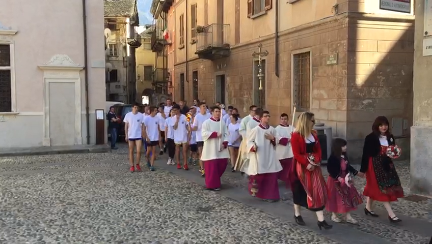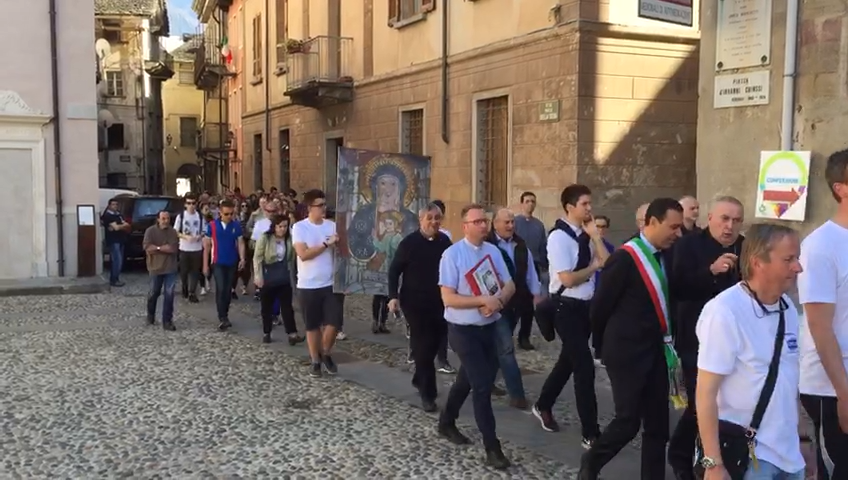 DOMODOSSOLA- 08-04-2017- E' arrivato anche il vescovo Franco Giulio Brambilla in piazza Mercato a Domo, accolto dal sindaco Lucio Pizzi e dal parroco don Vincenzo Barone per accogliere la copia del ritratto della Madonna del Sangue di Re, portata dai tantissimi partecipanti alla veglia delle Palme in occasioen della XXXII Giornata mondiale della gioventù diocesana. Migliaia i giovani attesi sin da questa sera, alle 20, 45 alla Madonna della Neve. Il quadro della Madonna di Re è stato portato in processione sino nella vicina chiesa di San Giuseppe di via Paolo Silva: "La Veglia delle Palme - spiegano dalla Diocesi-è il più importante appuntamento diocesano di pastorale giovanile, che aggrega intorno al Vescovo tutti i ragazzi della Diocesi in occasione della XXXII Giornata mondiale della gioventù. Tutti i giovani, dai 16 anni in su, sono invitati a vivere la Veglia delle Palme, preceduta da un pomeriggio di festa dei giovani: un'esperienza di incontro e preghiera nella dimensione della Chiesa Diocesana con il nostro Vescovo. Tema della Veglia sarà "Grandi cose in me", in questo primo anno del triennio in preparazione alla Giornata Mondiale della Gioventù di Panama: tre anni in cui, secondo le indicazioni di Papa Francesco, verrà messa al centro la figura di Maria".