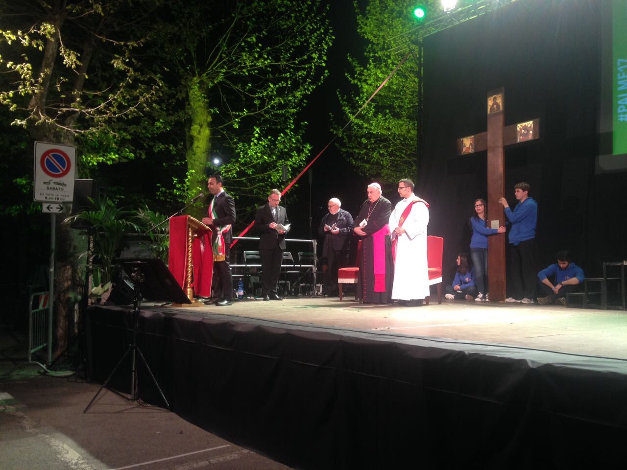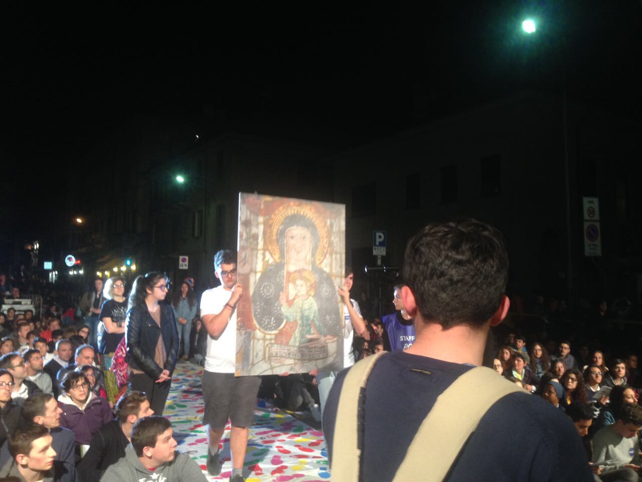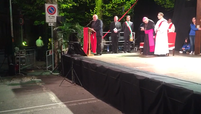 DOMODOSSOLA-09-04-2017- Migliaia di giovani hanno pacificamente invaso Domodossola sabato sera per la Veglia delle Palme celebrata alla madonna della Neve in occasione dlla Giornata Mondiale della Gioventù, evento che nella diocesi si celebra nel capoluogo ossolano. Via Rosmini qusi non è bastata a contenere tutti i giovani partecipanti all'evento: “Una presenza numerosa e gioiosa quest'oggi a Domo- spiega don Riccardo Zaninetti, vice direttore pastorale giovanile- sono qui per vivere un momento di spiritualità e di fede, oltre a sperimentare la gioia di stare insieme”. “Porgo a voi tutti il mio personale benvenuto e quello dell'amministrazione- ha spiegato il sindaco Lucio Pizzi-sono particolarmente emozionato a trovarmi davanti a tanti giovani ed onorato che la Giornata mondiale della gioventù si sviluppi anche a Domodossola per la Veglia delle Palme, oggi voi ragazzi avete dato vita alla nostra città, portando nuova energia con positivi messaggi di impegno e passione”. “Vi dò il benvenuto- ha spiegato il parroco don Vincenzo Barone- questi sono gli ossolani, forti, ma capaci di dare il cuore. Grazie di essere qui, siete testimonianza per i giovani del territorio, di una fede che si può raccontare.Questa sera gridate grandi cose, che il signor compie in noi quando l'accogliamo nel cuore”.