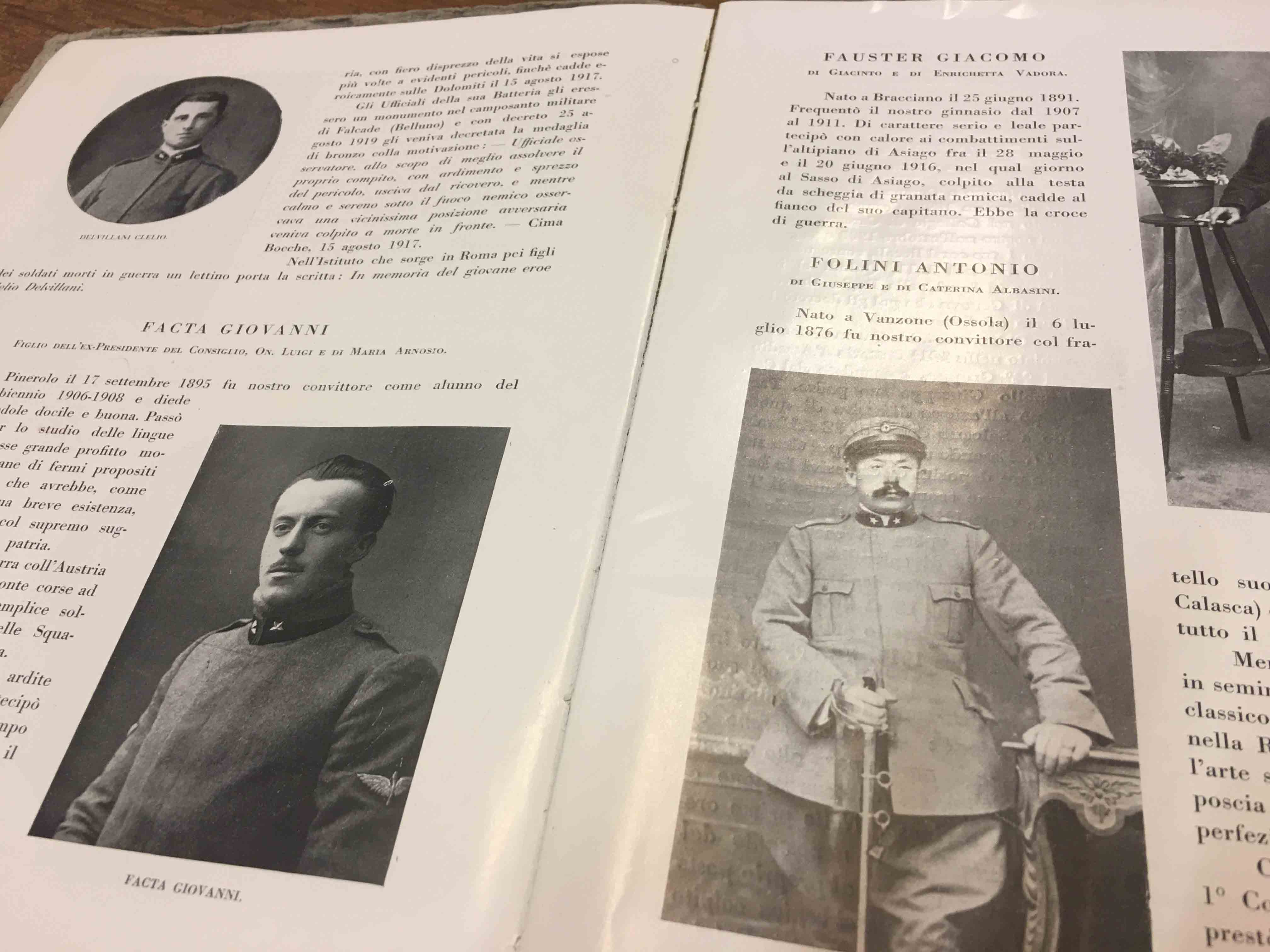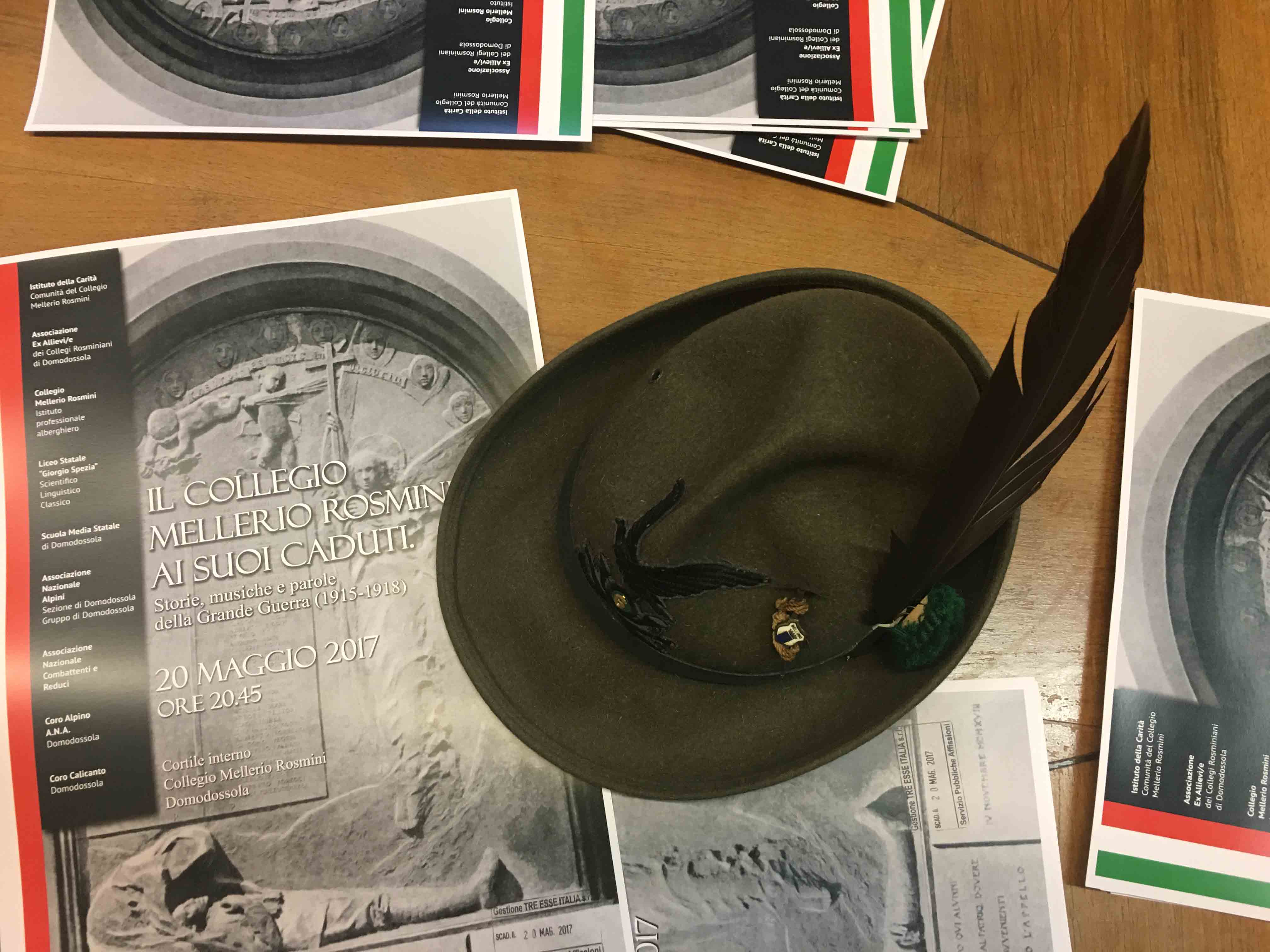 al Collegio Mellerio Rosmini sabato 20 maggio alle 20.45. L'idea nasce dalla volontà di commemorare gli ex allievi caduti durante la prima guerra mondiale, 98 alunni dell'Istituto caduti sui vari fronti. Attraverso il lavoro del Professor Gianoglio è stata ritrovata presso i Padri del Calvario una pubblicazione del 1922, che ne riporta la fotografia ed una piccola biografia, con alcune notizie della loro vita, la classe frequentata e le vicissitudini per cui partirono per il fronte fino a perdere la vita. Con l'aiuto degli insegnanti dell'Istituto Alberghiero e del Liceo Spezia sono state scelte dieci storie significative di ossolani e convittori. Insieme con i ragazzi, attraverso il testo, tramite ricerche accurate, e le memorie dei parenti ancora in vita, sono state ricostruite le storia dei dieci caduti che verranno commemorati il 20 maggio, anche con musiche e canti. Nel cortile interno infatti i caduti impersonati dagli studenti, si affacceranno dalle camerate del convitto, e con una suggestione di luci e suoni ne verrà proiettata la fotografia con il sottofondo di musiche eseguite dagli alunni delle scuole medie, che accompagneranno l'esecuzione dei canti alpini grazie al Coro femminile Calicanto ed all'Ana. Per l'occasione verrà eseguito un inno ritrovato, “l' Inno ai caduti del Rosmini” scritto da Padre Bozzetti.